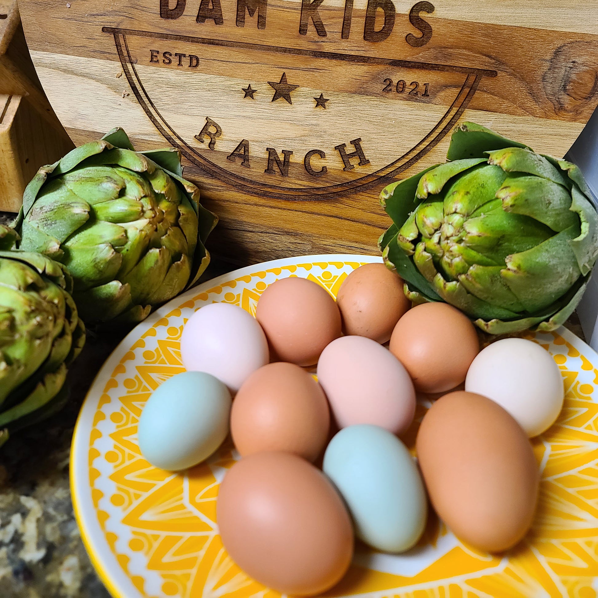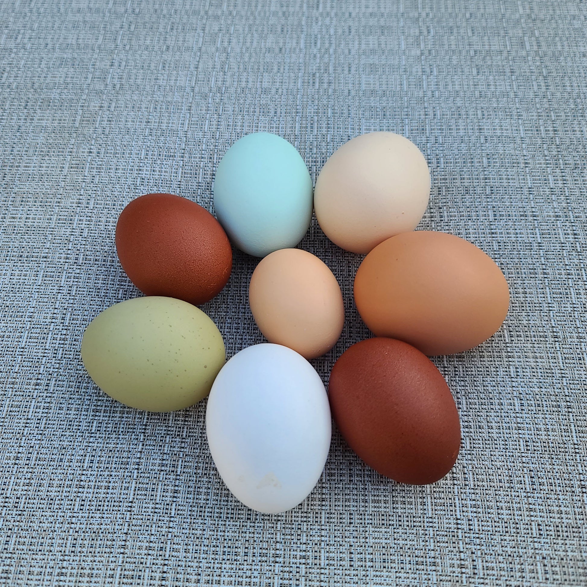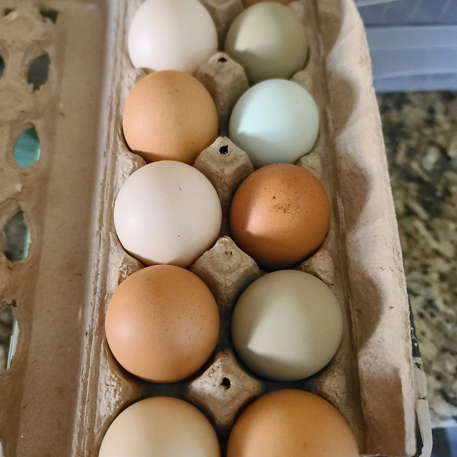 ¡1 docena de huevos frescos y coloridos de nuestra bandada de gallinas ponedoras felices y criadas en libertad! Alimentamos a nuestras gallinas con alimentos no modificados genéticamente de alta calidad, con muchas golosinas y forraje fresco, y nunca probará un huevo mejor. Los huevos varían de grandes a gigantes y pueden ser blancos, rosados, tostados, marrón oscuro, azules, verdes u oliva.